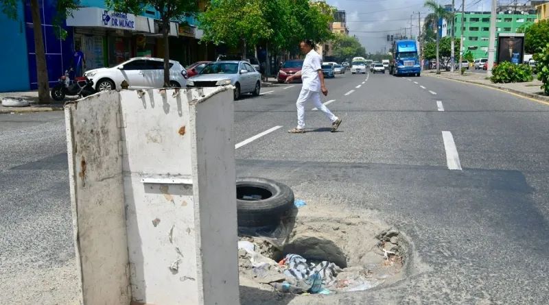 Conductores se exponen a accidentarse por un hoyo que se amplía con el paso de vehículos en la avenida México casi esquina Juana Saltitopa en el sector de Villa Francisca, sin que ninguna autoridad se preocupe por resolver el problema en la transitada vía.