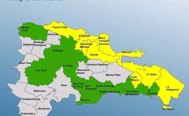 Las provincias en alerta amarilla son: Puerto Plata, María Trinidad Sánchez, Espaillat, Hato Mayor, El Seibó, Samaná, Duartes, Hermanas Mirabal y La Altagracia.