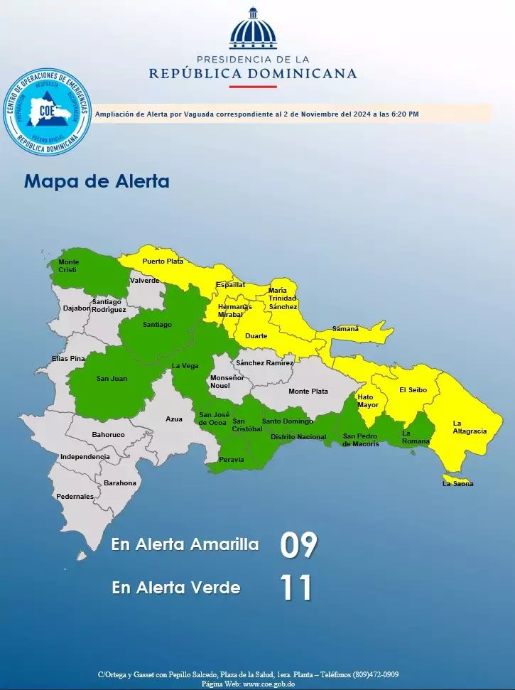 Mientras que las provincias en alerta verde aumentaron: Santo Domingo, Distrito Nacional, La Vega, San Cristóbal, La Romana, San Juan, Montecristi, Santiago, San Pedro de Macorís, San José de Ocoa y Peravia.