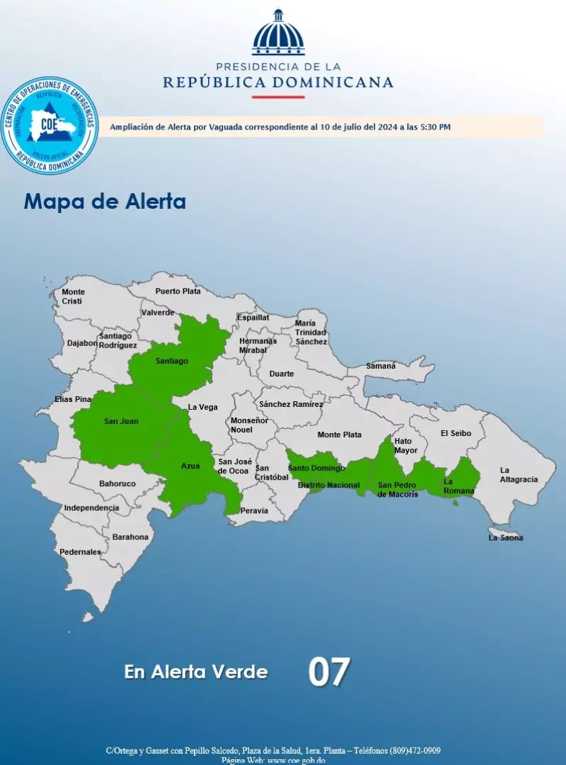 En alerta se encuentra la Prov. Santo Domingo, La Romana, Distrito Nacional, Santiago, San Pedro de Macorís, Azua y San Juan.