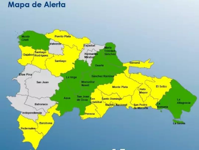 En alerta verde están: Monte Cristi, Monseñor Nouel, San José de Ocoa, La Altagracia, Azúa, La Romana, La Vega, Duarte (especial el Bajo Yuna), Sánchez Ramírez y María Trinidad Sánchez.