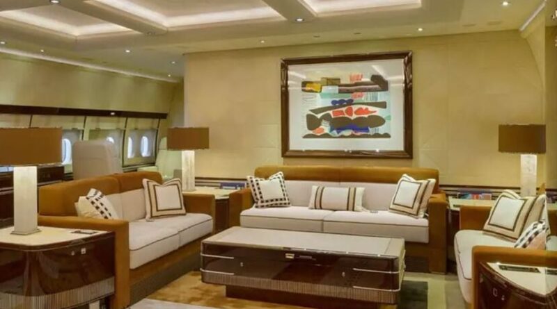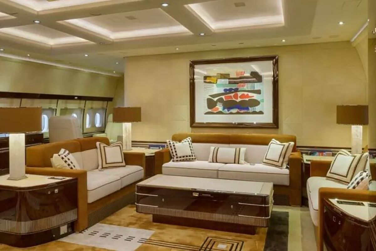 Es, en esencia, una verdadera Torre Trump en el cielo: dormitorio principal, habitación para invitados, once baños, cinco cocinas, despacho privado. Y además: cinco salas de estar, televisión en directo e internet, acabados dorados, 40 televisores, paneles de madera fina que cubren incluso los escalones de la escalera interna que conecta los dos «pisos» del avión. En lugar de los 460 asientos que tendría en configuración comercial, sólo hay cinco filas de asientos business. A bordo hay espacio para 90 pasajeros y 14 miembros de la tripulación.